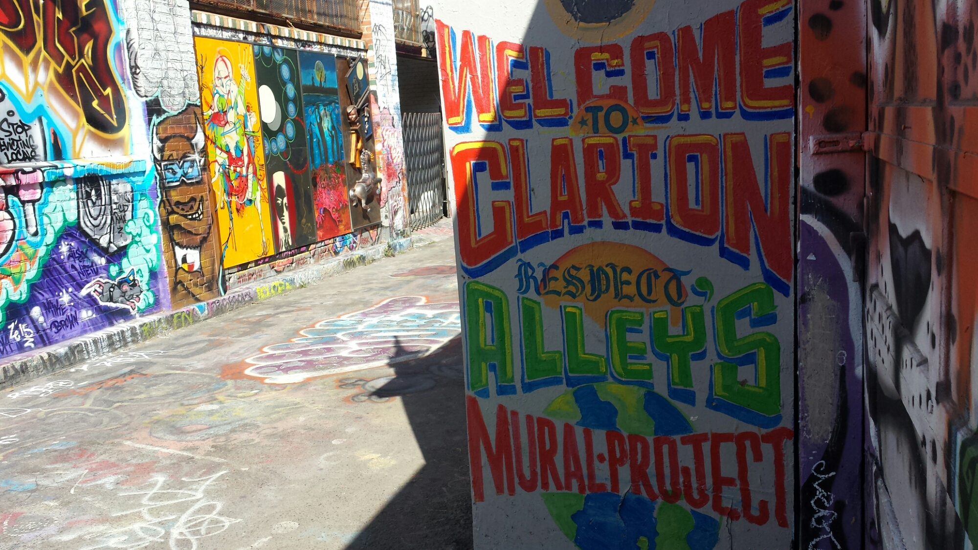 The Mission District is a hip neighborhood. It’s roots are as the Latin American immigrant neighborhood; it hosted a large punk scene in the 80s (I had Rancid songs in my head the whole time we were in SF, taking me back to my angsty teen years. It was cool being in the places that are referenced in songs that I was listening to as a 14 year old kid in the Mid North of SA) and started becoming gentrified in the 90s with the dotcom boom. Now its kinda a mix between the old and new. We almost felt unsafe of Mission St but one block over on Valencia it was hipster central. We didn’t spend much time in Mission, we walked through and sat in Dolores Park (great views of the city. That’s the pay off for trudging up these hills we’d call mountains at home) and then walked back to the metro via Clarion Alley. Clarion Alley is wall to wall street art. Amazing.